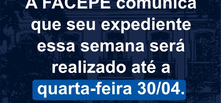 A FACEPE comunica que em razão da determinação de ponto facultativo no dia 02/05 nas repartições públicas, seu expediente esta semana será até quarta-feira, dia 30/04. Retornaremos na segunda-feira, dia 05/05.