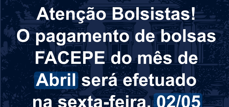 A Fundação de Amparo à Ciência e Tecnologia de Pernambuco (FACEPE), entidade vinculada à Secretaria de Ciência, Tecnologia e Inovação (SECTI/PE), comunica aos bolsistas ligados à Fundação, que o pagamento das bolsas FACEPE do mês de ABRIL será efetuado na SEXTA-FEIRA, 02/05.