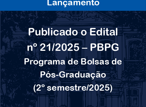 Publicado o Edital nº 21/2025 – PBPG: Programa de Bolsas de Pós-Graduação (2º semestre/2025), que apoiará 80 (oitenta) bolsas de mestrado acadêmico e 50 (cinquenta) de doutorado, também acadêmico, para estudantes ingressantes exclusivamente no 2º semestre de 2025.