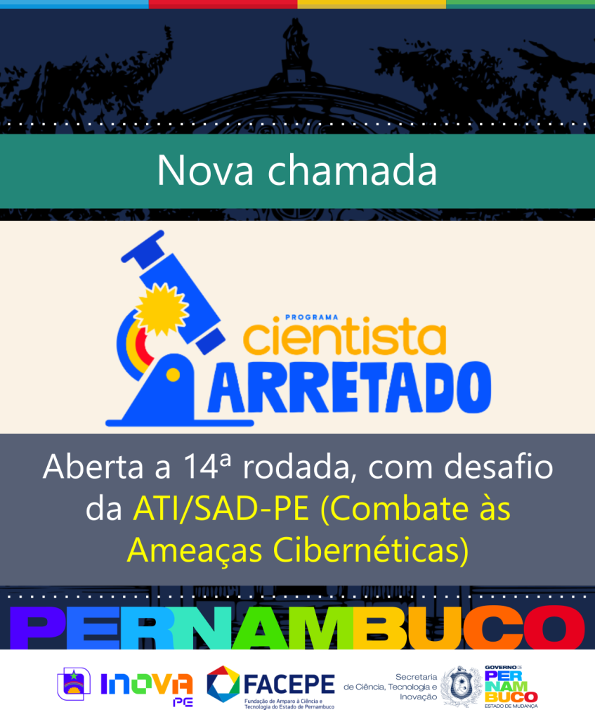 Foi publicada a 14ª rodada do Programa Cientista Arretado, referente ao Adendo nº 03 ao Edital nº 40/2024. Com investimento de R$ 1,05 milhão, essa rodada contempla um desafio proposto pela Agência Estadual de Tecnologia da Informação (ATI), vinculada à Secretaria de Administração do Estado de Pernambuco (SAD‑PE), na temática “Combate às ameaças cibernéticas”.