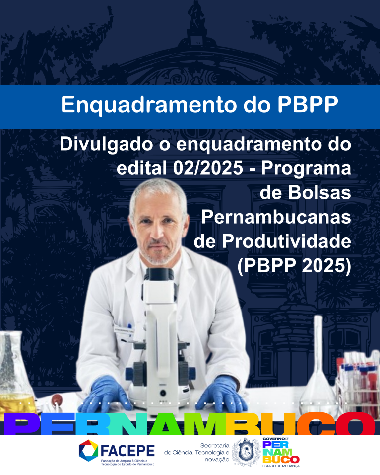 A Fundação de Amparo à Ciência e Tecnologia de Pernambuco (FACEPE), instituição do Governo do Estado, vinculada à Secretaria de Ciência, Tecnologia e Inovação (SECTI/PE), divulga a relação dos projetos enquadrados no edital 02/2025, do Programa de Bolsas Pernambucanas de Produtividade – PBPP, edição 2025. Nesta etapa de avaliação foram enquadradas 42 propostas e 15 desenquadradas.