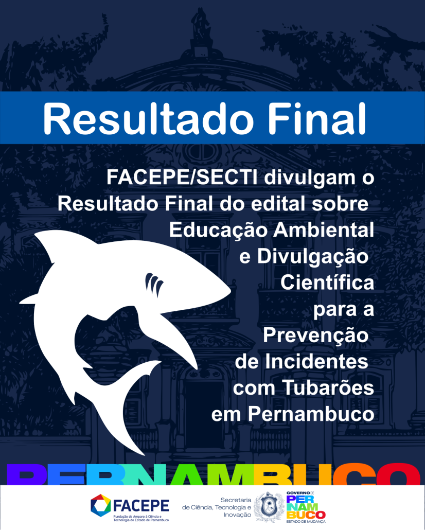 A Fundação de Amparo à Ciência e Tecnologia do Estado de Pernambuco – FACEPE, instituição do Governo de Pernambuco, vinculada à Secretaria de Ciência, Tecnologia e Inovação – SECTI/PE divulga o Resultado Final do Edital 34/2024 – Projetos Orientados a Missões: Educação Ambiental e Divulgação Científica Para a Prevenção de Incidentes com Tubarões em Pernambuco.