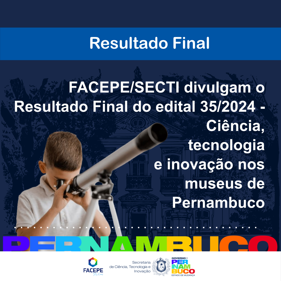 A Fundação de Ciência, Tecnologia e Inovação (FACEPE), instituição do Governo de Pernambuco vinculada à Secretaria de Ciência Tecnologia e Inovação (SECTI-PE), divulga o Resultado Final do edital 35/2024 – Ciência, Tecnologia e Inovação nos museus de Pernambuco.
