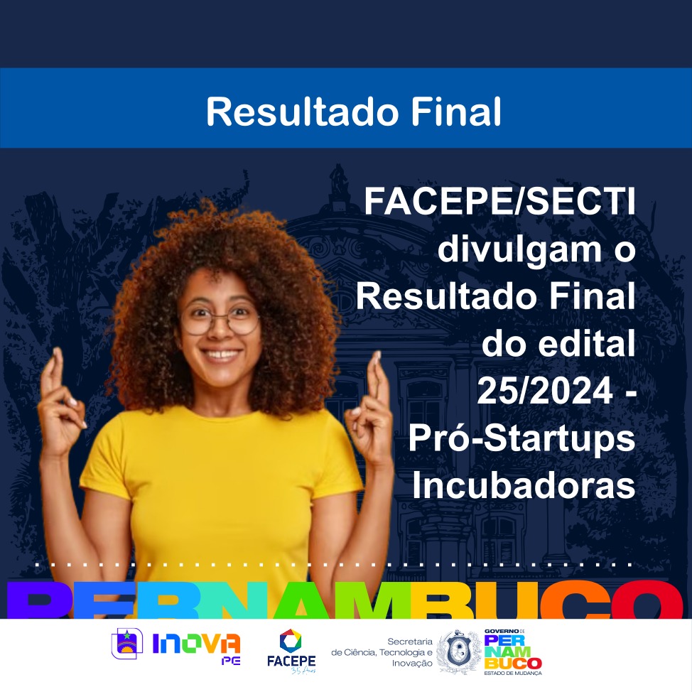 O Governo de Pernambuco e a Secretaria de Ciência, Tecnologia e Inovação (SECTI-PE), por meio da Fundação de Amparo à Ciência e Tecnologia do Estado de Pernambuco (FACEPE), com recursos do Fundo Inovar-PE, gerido pela Agência de Empreendedorismo de Pernambuco (AGE), vinculada à Secretaria de Desenvolvimento Profissional e Empreendedorismo (SEDEPE), divulgam o Resultado Final do Edital nº 25/2024 – Pró-Startups Incubadoras, após análise de recursos interpostos, conforme previsto no item 6.3 do edital.