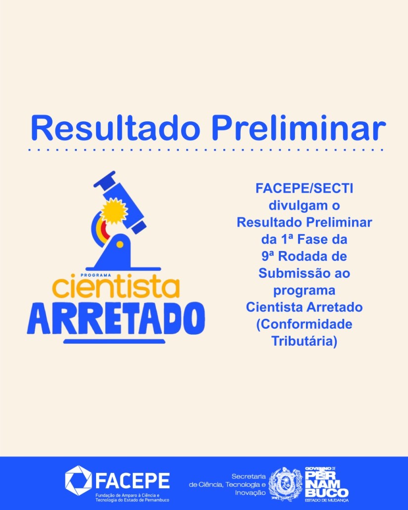 O Governo de Pernambuco e a Secretaria de Ciência, Tecnologia e Inovação (SECTI-PE), por meio da Fundação de Amparo à Ciência e Tecnologia do Estado de Pernambuco (FACEPE), divulgam o Resultado Preliminar da Primeira Fase da Nova Rodada ao edital nº 14/2024-FACEPE – Ciência no Governo: Programa Cientista Arretado.
