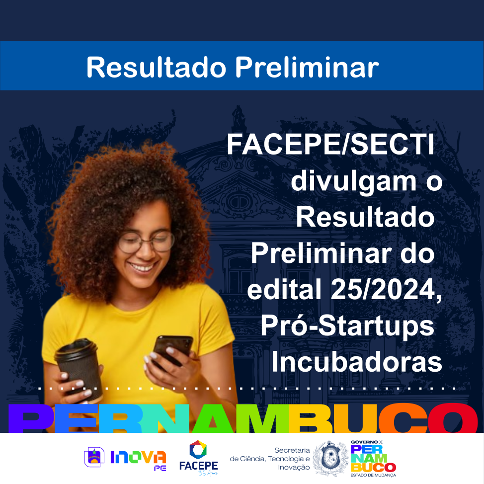 A Fundação de Amparo à Ciência e Tecnologia de Pernambuco (FACEPE), instituição do Governo de Pernambuco, vinculada à Secretaria de Ciência, Tecnologia e Inovação (SECTI/PE), divulga o Resultado preliminar do edital de número 25/2024: Pró-Startups Incubadoras.