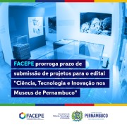 A Fundação de Amparo à Ciência e Tecnologia do Estado de Pernambuco (FACEPE), vinculada à Secretaria de Ciência, Tecnologia e Inovação de Pernambuco (SECTI), prorroga o prazo de submissão do edital “CIÊNCIA, TECNOLOGIA E INOVAÇÃO NOS MUSEUS DE PERNAMBUCO“ para 10 de janeiro de 2022. O investimento é de R$ R$ 1.050.000,00 (um milhão e cinquenta mil reais) para viabilizar a pesquisa científica em Museus. Serão 150 bolsas de incentivo acadêmico para promoção de estudos nestas instituições.