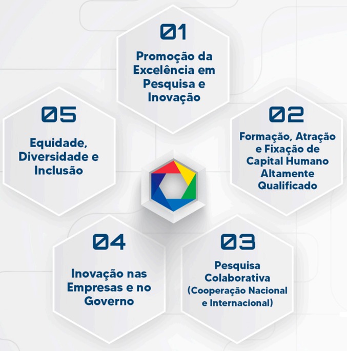 Os cinco eixos formam uma visão integrada e sistêmica da política de fomento: abrangem o fortalecimento da pesquisa científica, a formação e valorização de recursos humanos qualificados, o estímulo à inovação e ao empreendedorismo tecnológico, e a articulação entre academia, setor produtivo, governos e sociedade civil.