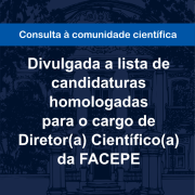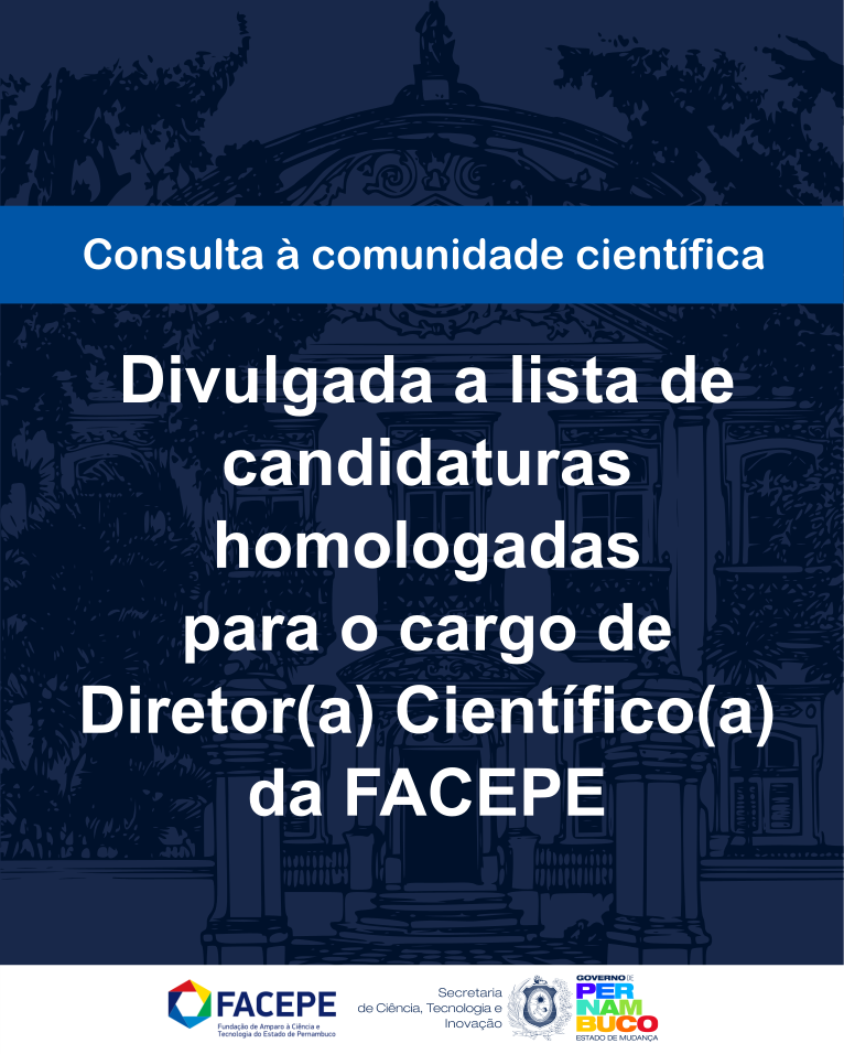 A Fundação de Amparo à Ciência e Tecnologia do Estado de Pernambuco – FACEPE comunica que a Comissão para Consulta à Comunidade Científica para a indicação de nomes ao cargo de Diretor(a) Científico(a) da FACEPE homologou três das quatro candidaturas inscritas, na reunião realizada no último dia 26.