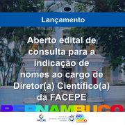A Fundação de Amparo à Ciência e Tecnologia do Estado de Pernambuco – FACEPE, instituição do Governo de Pernambuco vinculada à Secretaria de Ciência e Tecnologia do Estado – SECTI/PE, torna público o Edital FACEPE n. 08/2025, de Consulta à Comunidade Científica para a indicação de nomes para o Cargo de Diretor(a) Científico(a) da instituição.