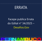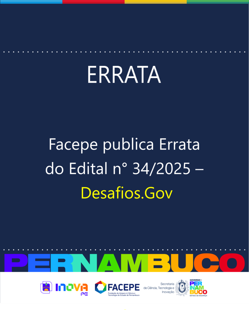 O Governo de Pernambuco, por meio da Secretaria de Ciência, Tecnologia e Inovação (Secti-PE) e da Fundação de Amparo à Ciência e Tecnologia do Estado de Pernambuco (Facepe), torna pública a Errata do Edital nº 34/2025 – Desafios. Gov.