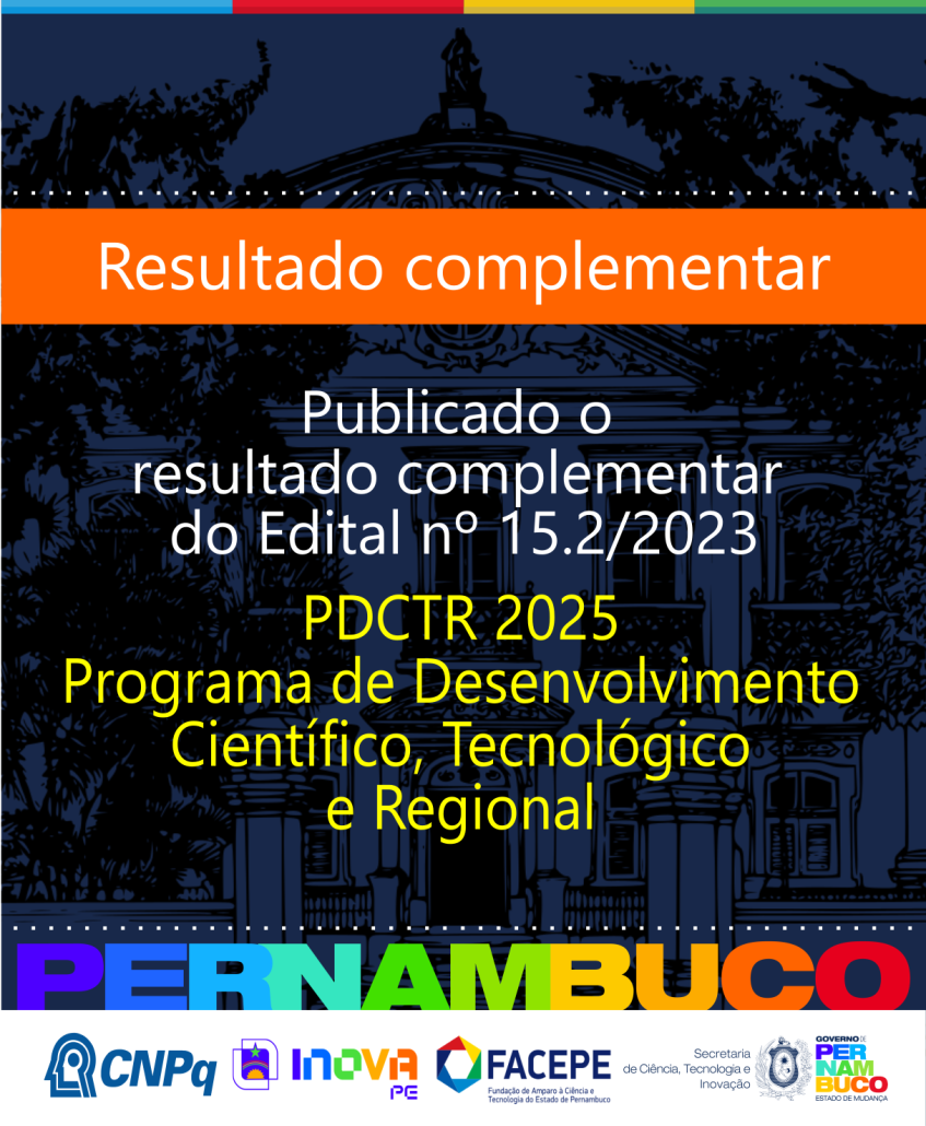 A Fundação de Amparo à Ciência e Tecnologia de Pernambuco (Facepe), instituição do Governo do Estado de Pernambuco, vinculada à Secretaria de Ciência, Tecnologia e Inovação (Secti-PE), em parceria com o Conselho Nacional de Desenvolvimento Científico e Tecnológico(CNPq), divulga o resultado complementar do Edital 15.2/2023 do Programa de Desenvolvimento Científico, Tecnológico e Regional – PDCTR 2025.
