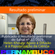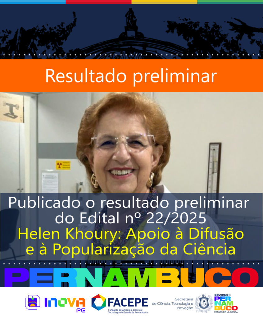 A Fundação de Amparo à Ciência e Tecnologia do Estado de Pernambuco (Facepe), em parceria com a Secretaria de Ciência, Tecnologia e Inovação (Secti-PE), concluiu a Etapa II da análise realizada pela Comissão Avaliadora de Julgamento das propostas submetidas ao Edital nº 22/2025 – Helen Khoury: Apoio à Difusão e à Popularização da Ciência, e divulga o resultado preliminar.