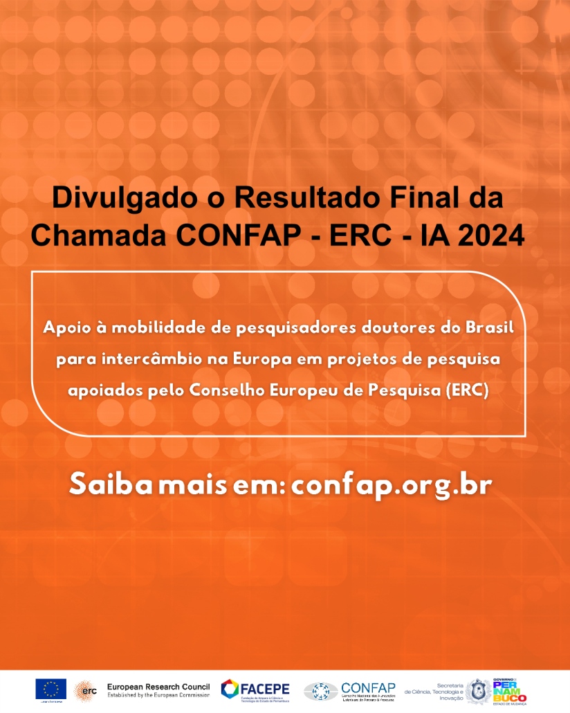 A Fundação de Amparo à Ciência e Tecnologia do Estado de Pernambuco (FACEPE) em parceria com o Conselho Nacional das Fundações Estaduais de Amparo à Pesquisa (CONFAP) divulgam o resultado da Chamada CONFAP – ERC IA 2024. A iniciativa faz parte do Acordo de Implementação (Implementing Arrangement – IA) firmado entre a Comissão Europeia e o CONFAP, voltado para o apoio à mobilidade de pesquisadores doutores sediados no Brasil. O acordo visa integrar equipes de pesquisadores na Europa em projetos sobre Inteligência Artificial, financiados pelo Conselho Europeu de Pesquisa (ERC).