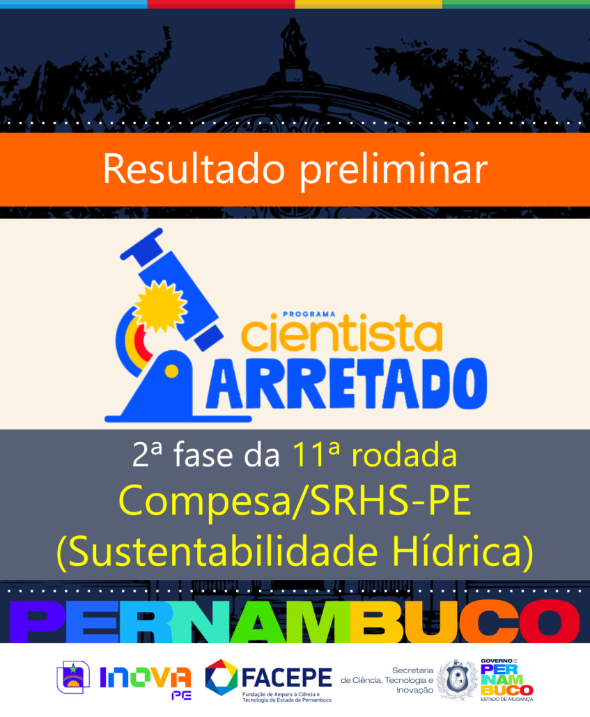 A Fundação de Amparo à Ciência e Tecnologia do Estado de Pernambuco (Facepe) publica o resultado preliminar da 11ª rodada do Programa Cientista Arretado, referente à 2ª fase da chamada aberta pelo Adendo nº 11 ao Edital nº 14/2024. Com investimento de R$ 1,05 milhão, essa edição contempla um desafio da Companhia Pernambucana de Saneamento (Compesa), vinculada à Secretaria de Recursos Hídricos e Saneamento do Estado de Pernambuco (SRHS‑PE), na temática “Sustentabilidade Hídrica: Supressão da Evaporação em Reservatórios do Semiárido.”