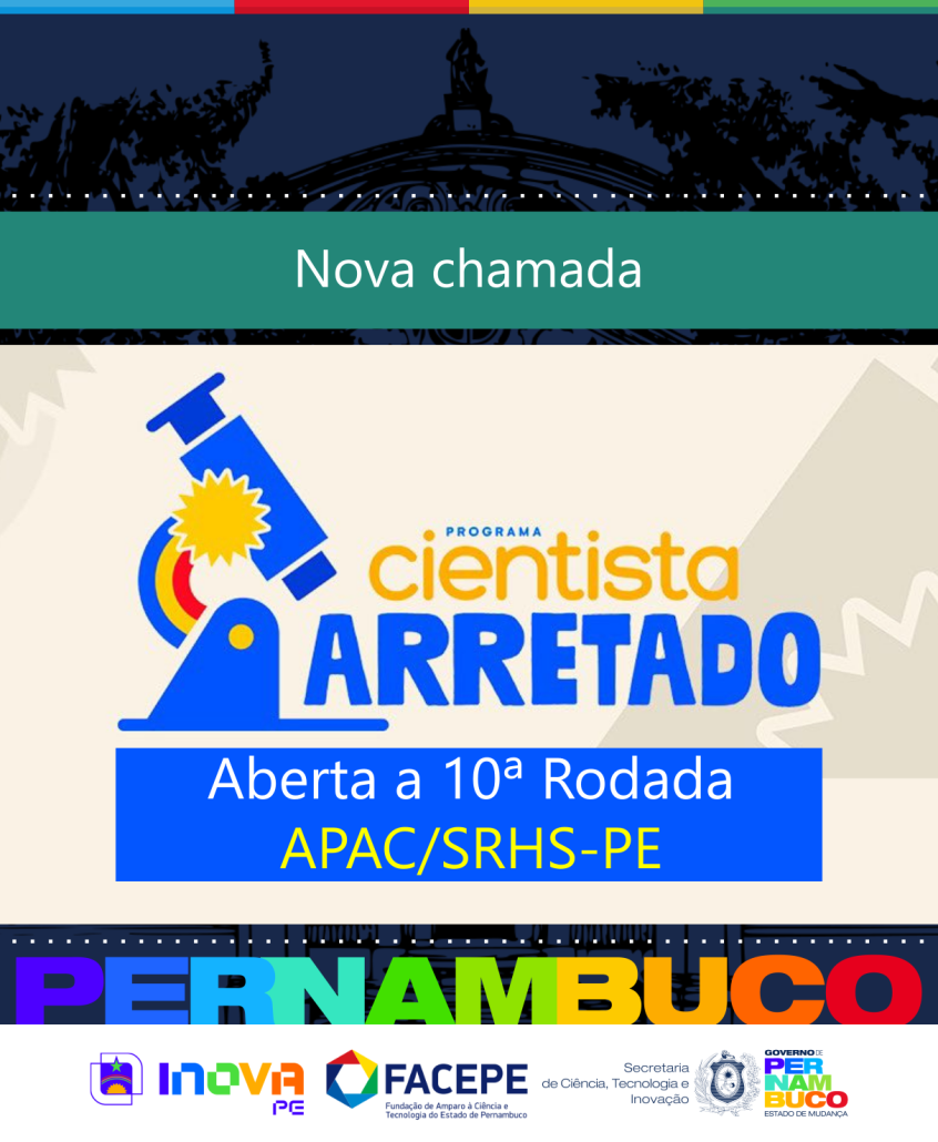 Iniciativa do Governo de Pernambuco, da Secretaria de Ciência, Tecnologia e Inovação (Secti-PE) e da Fundação de Amparo à Ciência e Tecnologia do Estado de Pernambuco (Facepe), o Programa Cientista Arretado visa promover inovações que solucionem desafios enfrentados por órgãos da gestão pública estadual, apoiando a cooperação entre governo e pesquisadores/as seniores, assim como seus grupos de pesquisa, vinculados/as a Instituições de Ciência, Tecnologia e Inovação (ICTs) do estado.