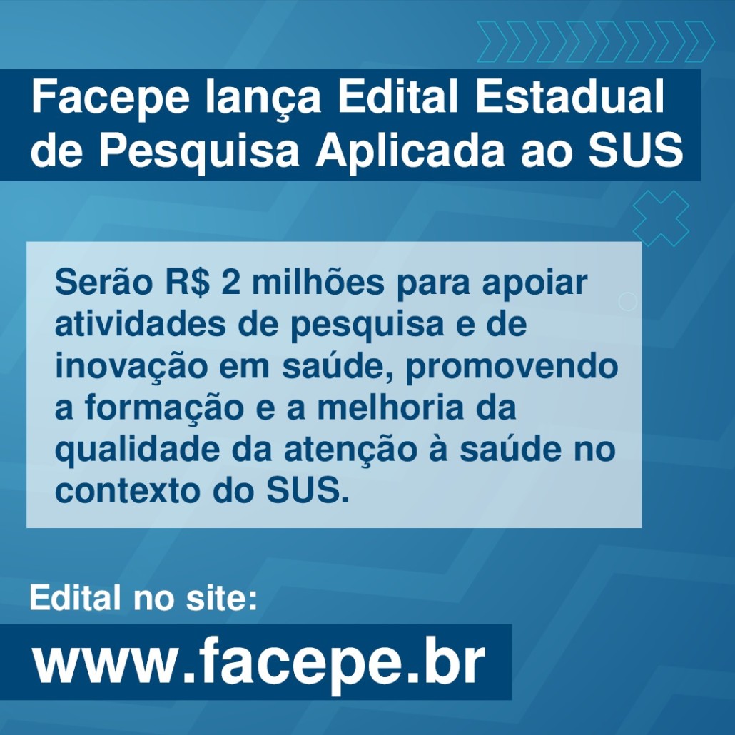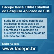 O Governo do Estado de Pernambuco, por intermédio da Fundação de Amparo à Ciência e Tecnologia de Pernambuco (FACEPE), vinculada à Secretaria de Ciência, Tecnologia e Inovação (SECTI), em parceria com a Secretaria Estadual de Saúde de Pernambuco (SES-PE), lançou nesta quinta-feira (07/07) edital de pesquisa aplicada ao Sistema público de Saúde, no valor de R$ 2 milhões. Os projetos serão executados a partir de outubro deste ano, após etapas de submissão e julgamento. O edital completo está disponível no site da Facepe.