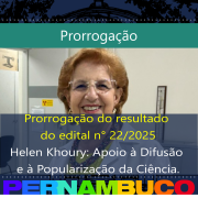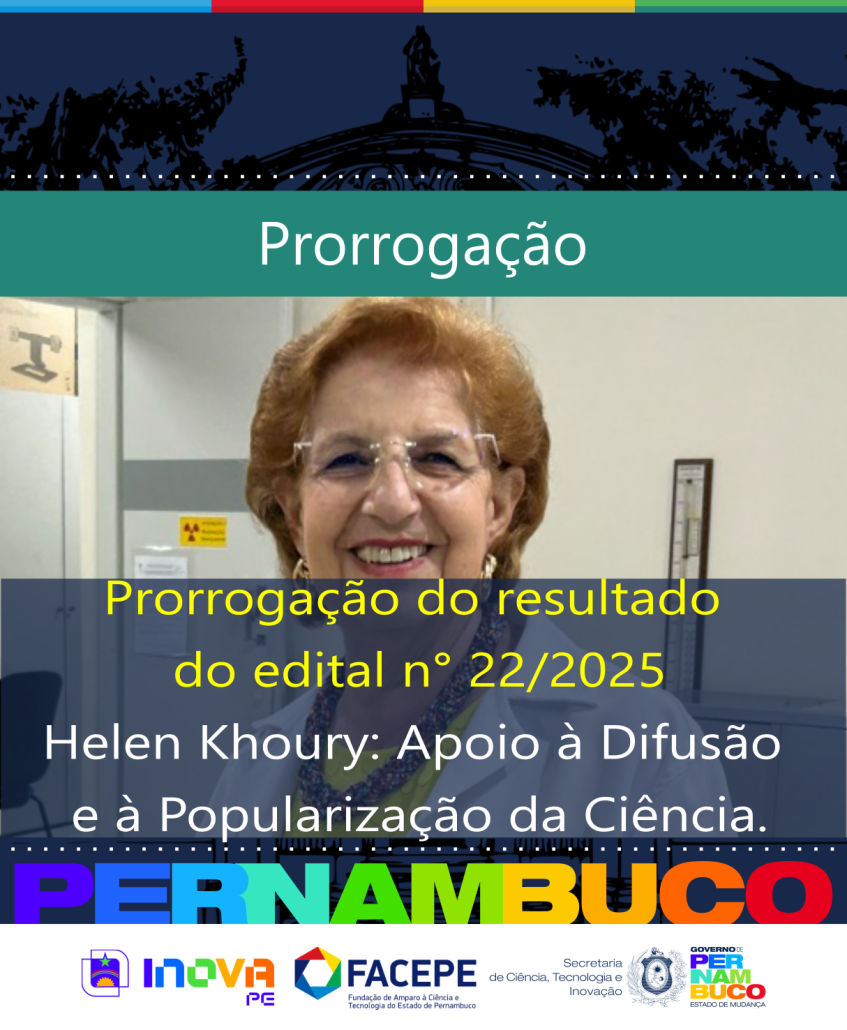 A Fundação de Amparo à Ciência e Tecnologia do Estado de Pernambuco (Facepe), vinculada à Secretaria de Ciência, Tecnologia e Inovação (Secti-PE), prorrogou o prazo para a divulgação dos resultados do Edital 22/2025 – Helen Khoury: Apoio à Difusão e à Popularização da Ciência.