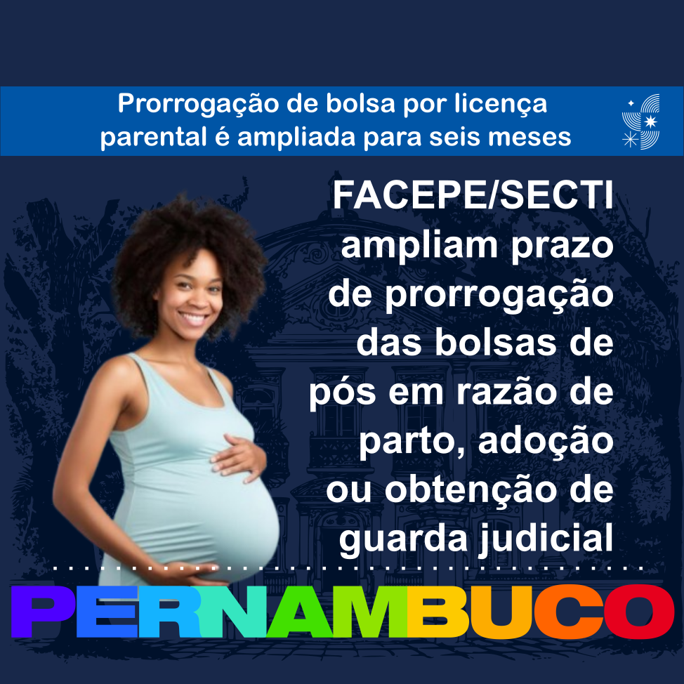A Fundação de Amparo à Ciência e Tecnologia do Estado de Pernambuco (FACEPE) e a Secretaria de Ciência, Tecnologia e Inovação (SECTI-PE) anunciam a ampliação do prazo para prorrogações de bolsas de pós-graduação (BPG-Mestrado e BPG-Doutorado), além das de pós-doutorado (BFPs), em razão de parto, nascimento de filho/filha, adoção ou obtenção de guarda judicial para fins de adoção.