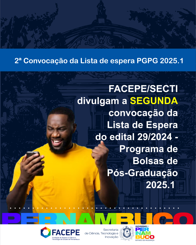A Fundação de Amparo à Ciência e Tecnologia do Estado de Pernambuco (FACEPE), vinculada à Secretaria de Ciência, Tecnologia e Inovação (SECTI/PE), publicou a segunda lista de espera referente ao Edital 29/2024 para concessão de bolsas de Pós-Graduação Strictu Sensu (PBPG) para o primeiro semestre de 2025.