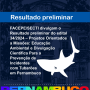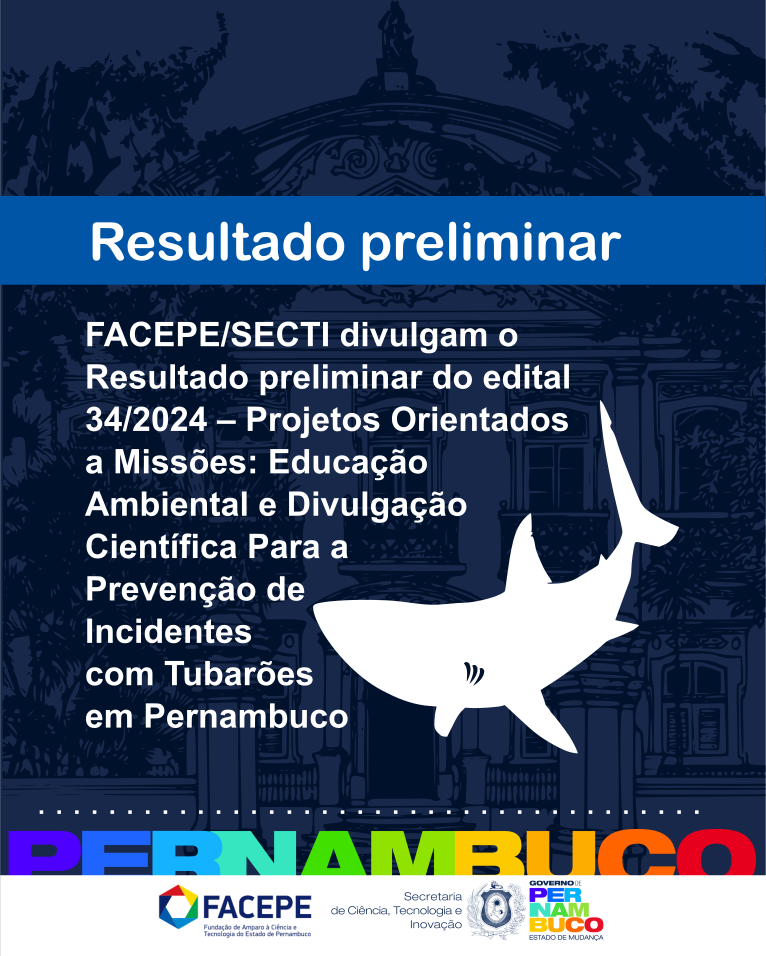 A Fundação de Amparo à Ciência e Tecnologia do Estado de Pernambuco – FACEPE, instituição do Governo de Pernambuco, vinculada à Secretaria de Ciência, Tecnologia e Inovação – SECTI/PE divulga o Resultado Preliminar do edital 34/2024 – Projetos Orientados a Missões: Educação Ambiental e Divulgação Científica Para a Prevenção de Incidentes com Tubarões em Pernambuco.
