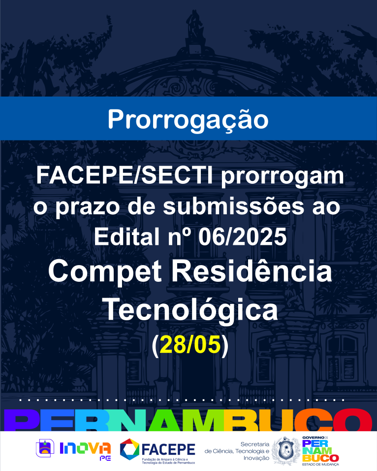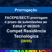 Devido a instabilidades de sistema, causadas por variações no fornecimento de energia à FACEPE, o Edital nº 06/2025 – Compet Residência Tecnológica teve o prazo de submissões prorrogado para a próxima quarta-feira, 28 de maio de 2025, até 23h59.