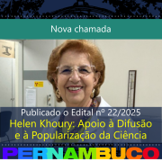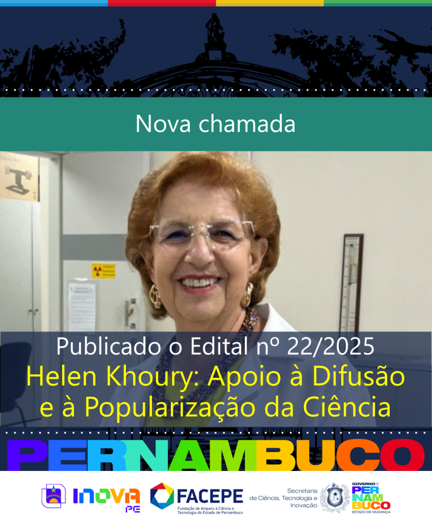 A Fundação de Amparo à Ciência e Tecnologia do Estado de Pernambuco (Facepe), em parceria com a Secretaria de Ciência, Tecnologia e Inovação (Secti-PE), lançou o Edital nº 22/2025 – Helen Khoury: Apoio à Difusão e à Popularização da Ciência, destinado ao apoio a projetos executados por Instituições de Ensino Superior (IES), Instituições de Ciência, Tecnologia e Inovação (ICTs), parques científicos, museus e entidades afins sediadas em Pernambuco.