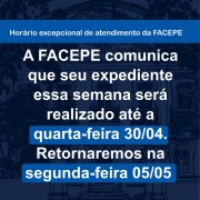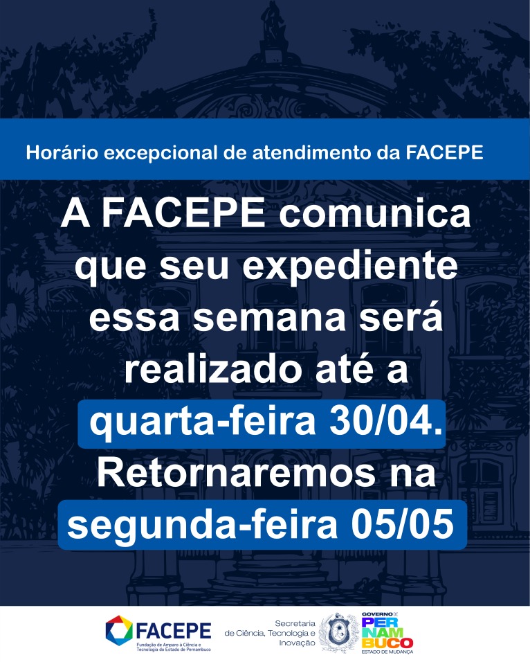A FACEPE comunica que em razão da determinação de ponto facultativo no dia 02/05 nas repartições públicas, seu expediente esta semana será até quarta-feira, dia 30/04. Retornaremos na segunda-feira, dia 05/05.