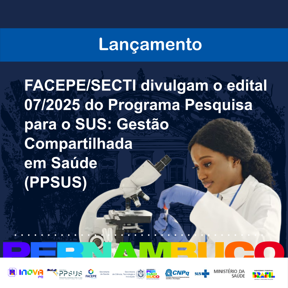 O Governo do Estado de Pernambuco, por meio da Fundação de Amparo à Ciência e Tecnologia de Pernambuco (FACEPE), vinculada à Secretaria de Ciência, Tecnologia e Inovação (SECTI PE), lançou nesta sexta-feira (14), na sede da SECTI PE, a 8ª edição do edital Nº 07/2025 – Programa Pesquisa Para o SUS: Gestão Compartilhada em Saúde – PPSUS Pernambuco.
