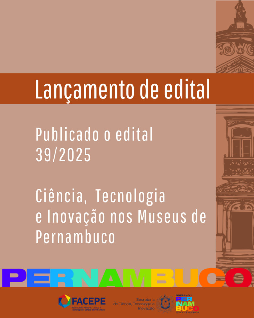 A Fundação de Amparo à Ciência e Tecnologia do Estado de Pernambuco (Facepe), vinculada à Secretaria de Ciência, Tecnologia e Inovação de Pernambuco (Secti-PE), divulgou nesta segunda-feira (20) o Edital nº 39/2025 – Ciência, Tecnologia e Inovação nos Museus.