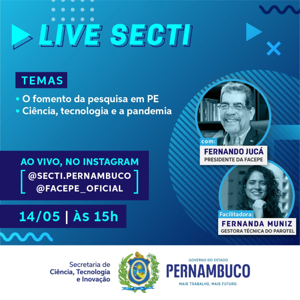 Live SECTI e FACEPE sobre o fomento da pesquisa em PE no dia 14/05 às 15h