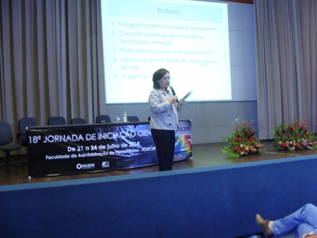Presidente da Fundação de Amparo à Ciência e Tecnologia do Estado de Pernambuco entre os anos de 1995 e 1999, a pesquisadora da Fundaj, Lúcia Carvalho Pinto de Melo, ministrou a palestra de encerramento da 18ª Jornada de Iniciação Científica da Facepe, na tarde desta quinta-feira (24), na Faculdade de Ciências da Administração de Pernambuco – FCAP/UPE, no Bairro da Madalena, Recife.