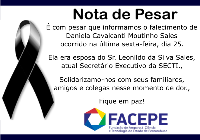 Destaque, Notícias Facepe, Pesquisador, Público em geral, Últimas notíciasNota de Pesar 28 de março de 2022 https://www2.facepe.br/wp-content/uploads/2022/03/Nota-de-Pesar-Daniela-Sales.png 465 663 Sandra Naoko https://www2.facepe.br/wp-content/uploads/2026/01/facepe-logo-1-1030x380.png Sandra Naoko2022-03-28 12:56:572022-03-28 12:56:57Nota de Pesar