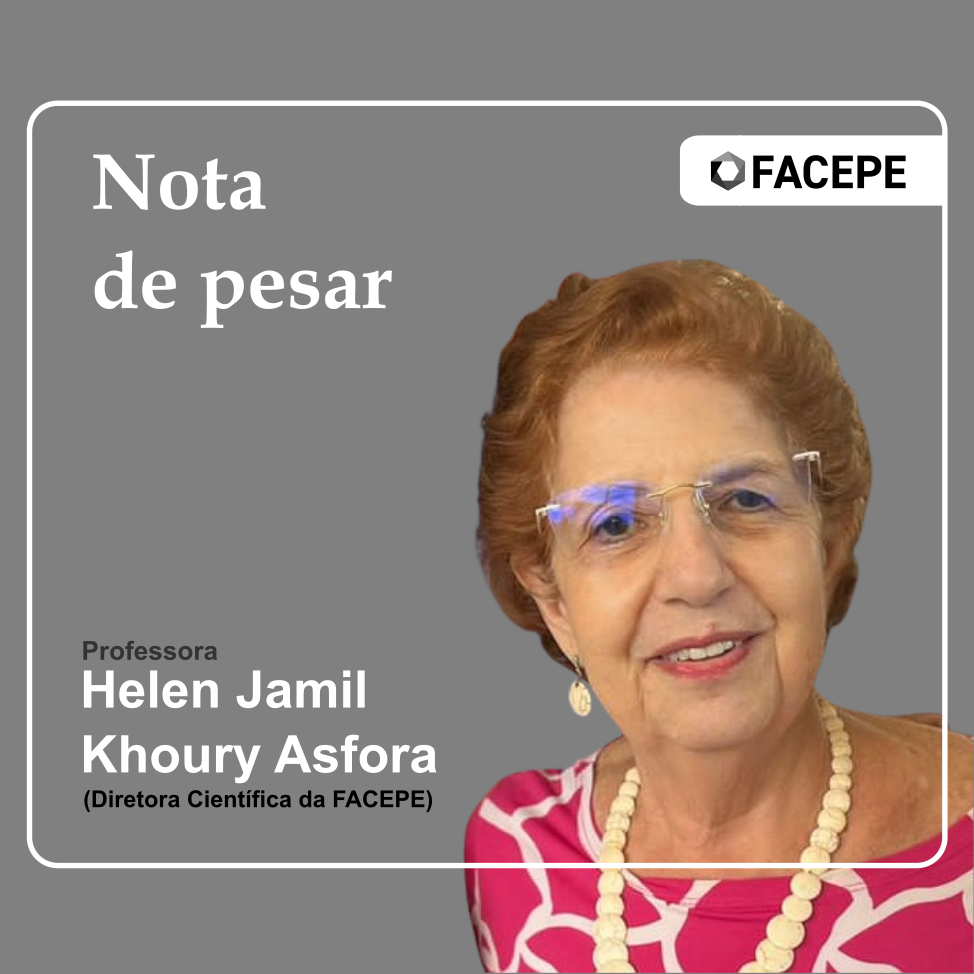 A Fundação de Amparo à Ciência e Tecnologia de Pernambuco (FACEPE) manifesta seu profundo pesar pelo falecimento da Profª Helen Jamil Khoury, ocorrido, neste domingo (02). Perdemos não apenas uma grande cientista, mas também uma professora inspiradora, uma gestora visionária e um ser humano extraordinário.