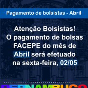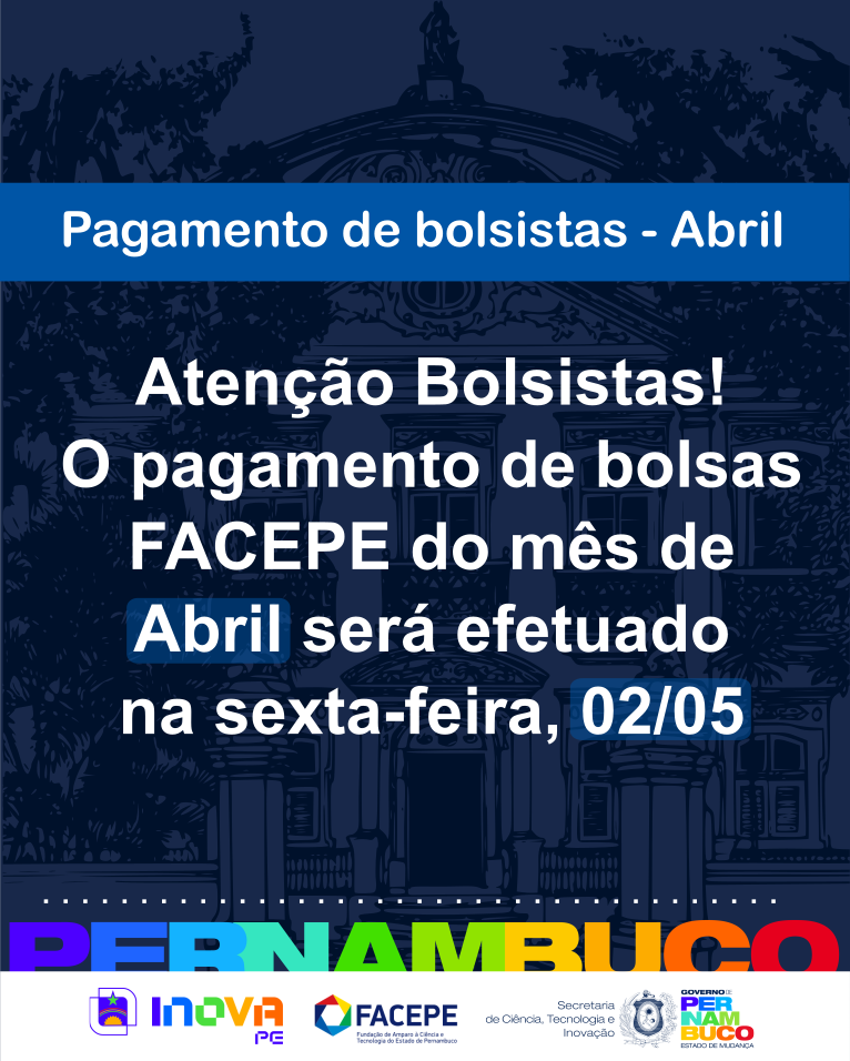A Fundação de Amparo à Ciência e Tecnologia de Pernambuco (FACEPE), entidade vinculada à Secretaria de Ciência, Tecnologia e Inovação (SECTI/PE), comunica aos bolsistas ligados à Fundação, que o pagamento das bolsas FACEPE do mês de ABRIL será efetuado na SEXTA-FEIRA, 02/05.