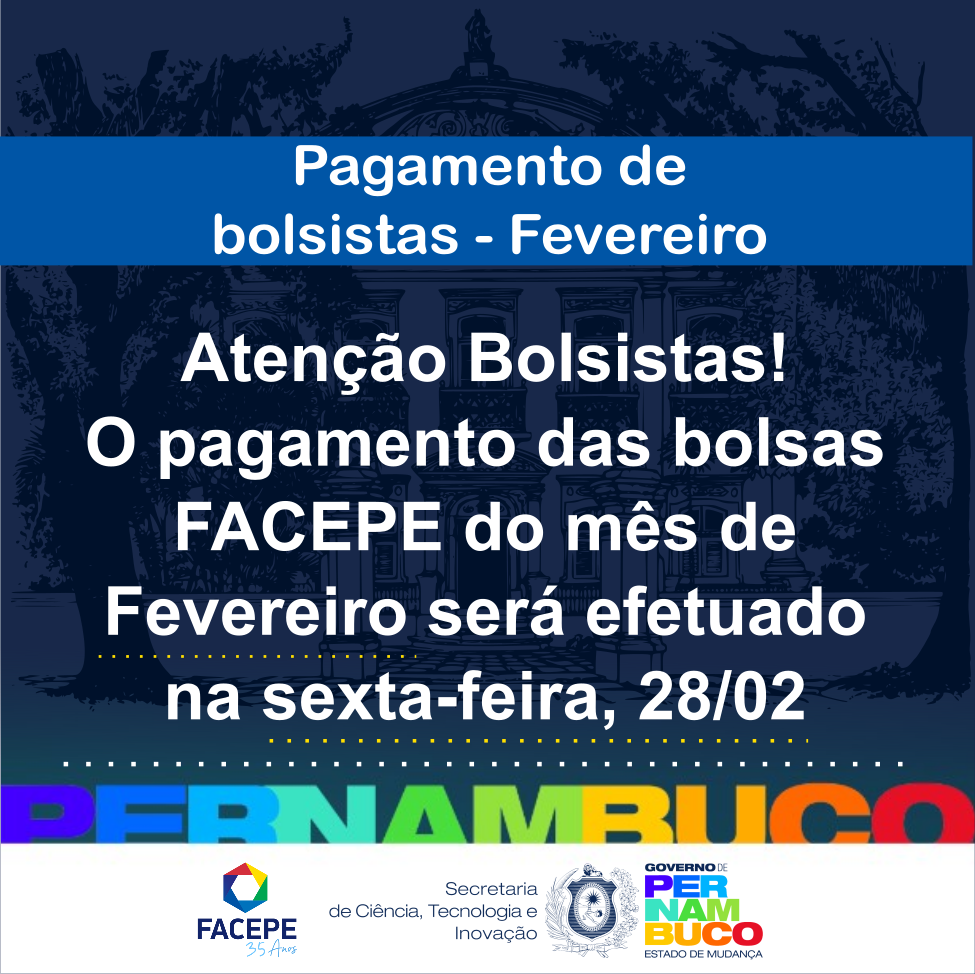 A Fundação de Amparo à Ciência e Tecnologia de Pernambuco (FACEPE), entidade vinculada à Secretaria de Ciência, Tecnologia e Inovação (SECTI/PE), comunica aos bolsistas ligados à Fundação, que o pagamento das bolsas FACEPE do mês de FEVEREIRO será efetuado na SEXTA-FEIRA, 28/02.