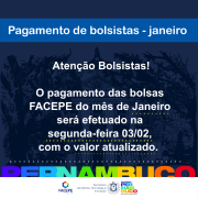 A Fundação de Amparo à Ciência e Tecnologia de Pernambuco (FACEPE), entidade vinculada à Secretaria de Ciência, Tecnologia e Inovação (SECTI/PE), comunica aos bolsistas ligados à Fundação, que o pagamento das bolsas FACEPE do mês de JANEIRO será efetuado na SEGUNDA-FEIRA, 03/02.
