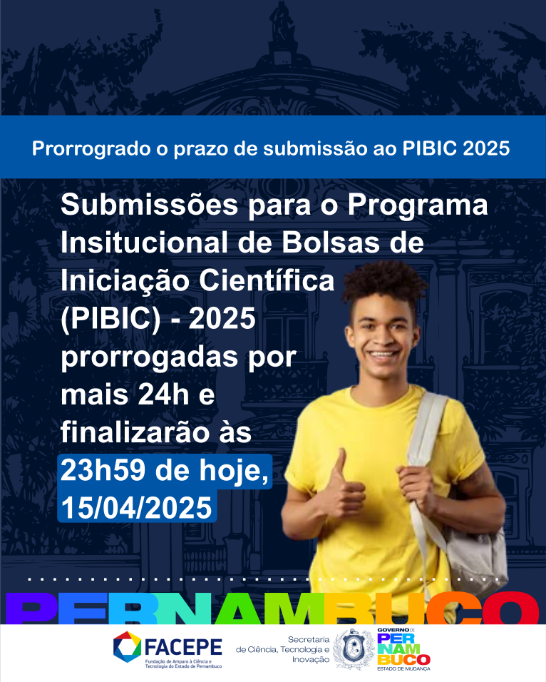 A Fundação de Amparo à Ciência e Tecnologia de Pernambuco (FACEPE), instituição vinculada à Secretaria de Ciência, Tecnologia e Inovação (SECTI/PE), informa que as submissões ao edital 01/2025, do Programa Institucional de Bolsas de Iniciação Científica – PIBIC 2025 foram prorrogadas por mais 24h e finalizarão às 23h59 desta terça-feira, 15 de abril. Esta prorrogação se deve em função da instabilidade do sistema ocorrida na noite da última segunda-feira(14/04).