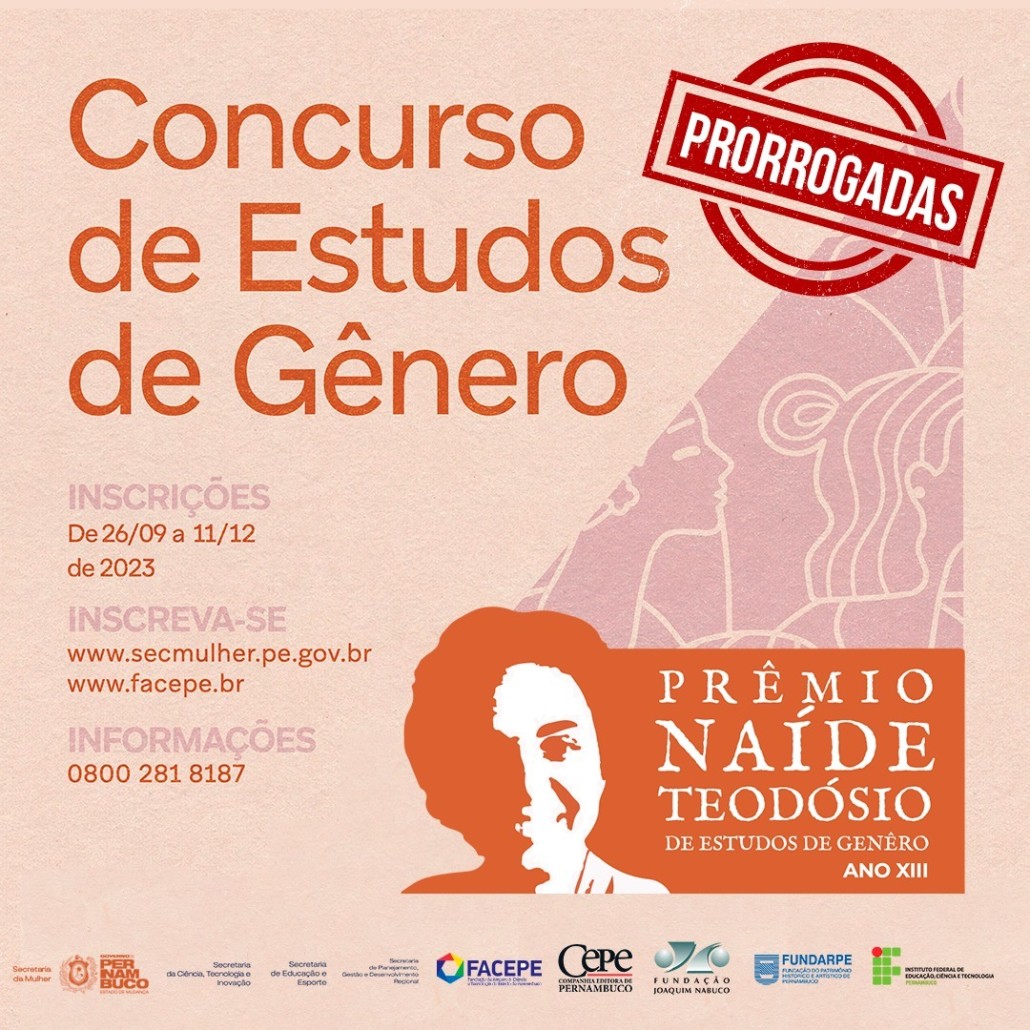 A Fundação de Amparo à Ciência e Tecnologia do Estado de Pernambuco (FACEPE) e a Secretaria da Mulher de Pernambuco (SecMulher-PE) informam que o prazo de submissão das propostas para o edital 08/2023 – Prêmio Naíde Teodósio de Estudos de Gênero Ano XIII – foi prorrogado até 11 de dezembro de 2023.