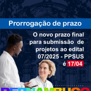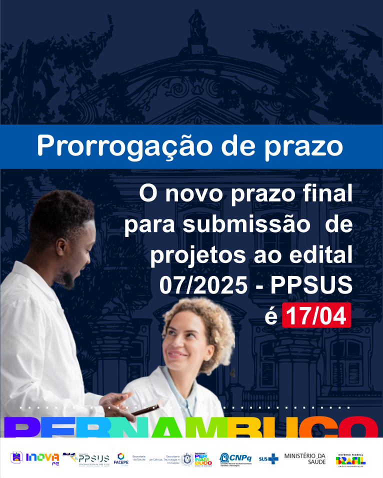 O Governo do Estado de Pernambuco, por meio da Fundação de Amparo à Ciência e Tecnologia de Pernambuco (FACEPE), vinculada à Secretaria de Ciência, Tecnologia e Inovação (SECTI PE), em parceria com a Secretaria Estadual de Saúde (SES-PE), o Ministério da Saúde (MS), por meio do Departamento de Ciência e Tecnologia da Secretaria de Ciência, Tecnologia e Inovação e do Complexo Econômico-Industrial da Saúde (Decit/SECTICS/MS), e o Conselho Nacional de Desenvolvimento Científico e Tecnológico (CNPq), informa que o prazo para entrega de propostas da 8ª edição do edital Nº 07/2025 – Programa Pesquisa Para o SUS: Gestão Compartilhada em Saúde – PPSUS Pernambuco será até 17 de abril de 2025.