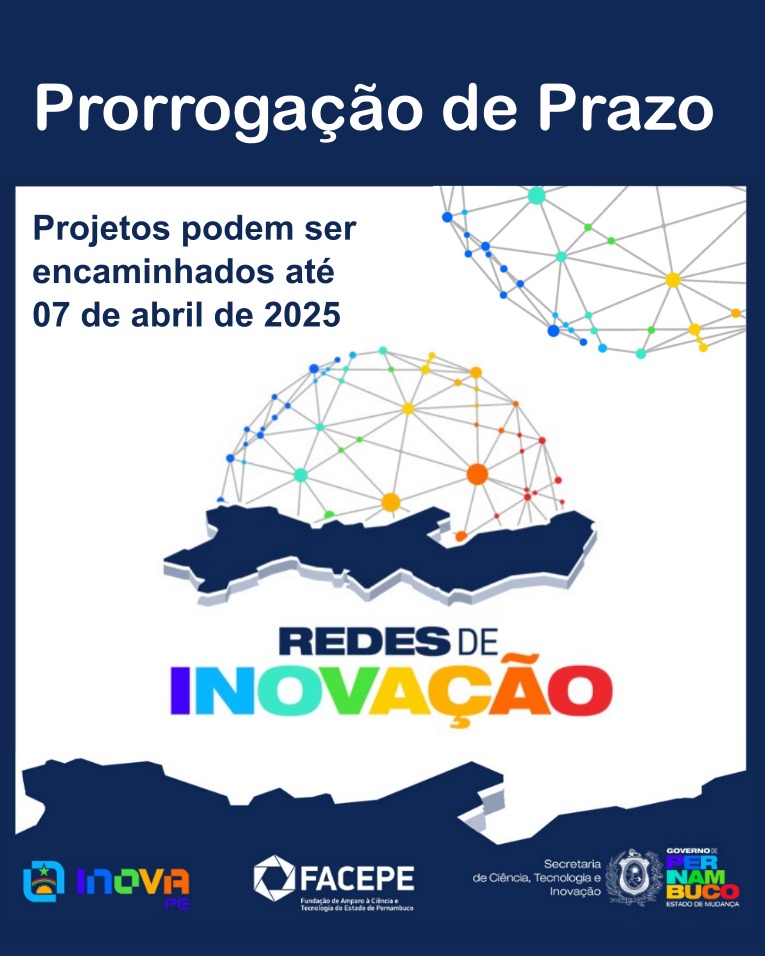 O Governo de Pernambuco e a Secretaria de Ciência, Tecnologia e Inovação – SECTI-PE, por meio da Fundação de Amparo à Ciência e Tecnologia de Pernambuco – FACEPE, tornam pública a prorrogação do prazo de submissão de propostas ao edital 04/2025 – Redes de Inovação. Os/as interessados/as terão até 07 de abril de 2025 para submeterem seus projetos através do sistema do Ambiente de Gestão de Informação e Logística- AgilFAP, acessado pelo site da FACEPE.