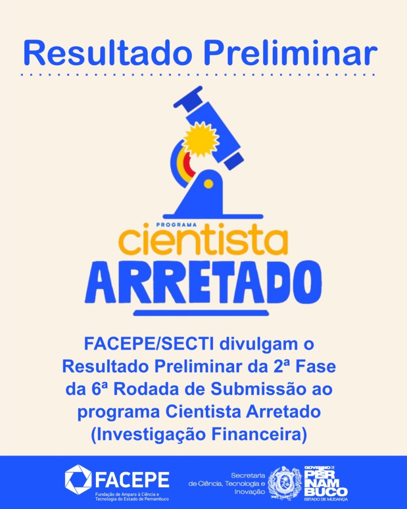 O Governo de Pernambuco e a Secretaria de Ciência, Tecnologia e Inovação (SECTI-PE), por meio da Fundação de Amparo à Ciência e Tecnologia do Estado de Pernambuco (FACEPE), divulgam o Resultado Preliminar da 2ª Fase da 6ª Rodada de Submissão ao Edital nº 14/2024 – Ciência no Governo: Programa Cientista Arretado.