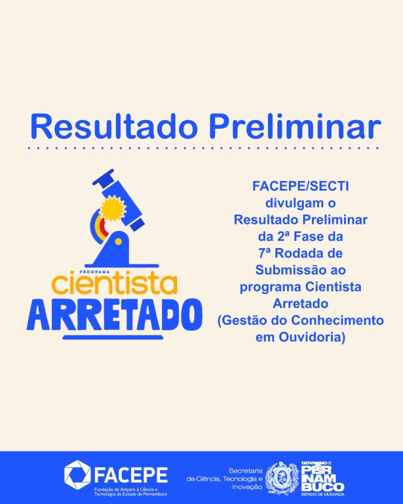 O Governo de Pernambuco e a Secretaria de Ciência, Tecnologia e Inovação – SECTI-PE, por meio da Fundação de Amparo à Ciência e Tecnologia de Pernambuco – FACEPE, divulgam o Resultado Preliminar da 2ª Fase da 7ª Rodada de Submissão ao Edital nº 14/2024-FACEPE – Ciência no Governo: Programa Cientista Arretado, cuja temática é Gestão do Conhecimento em Ouvidoria.