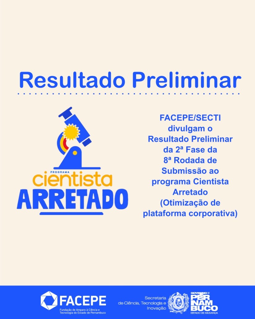 O Governo de Pernambuco e a Secretaria de Ciência, Tecnologia e Inovação – SECTI-PE, por meio da Fundação de Amparo à Ciência e Tecnologia de Pernambuco – FACEPE, divulgam o Resultado Preliminar da 2ª Fase da 8ª Rodada de Submissão ao Edital nº 14/2024-FACEPE – Ciência no Governo: Programa Cientista Arretado, cuja temática é Otimização de Plataforma Corporativa. O programa, que visa promover inovações que solucionem desafios enfrentados por órgãos da gestão pública estadual, busca apoiar a cooperação entre governo e pesquisadores/as sêniores, assim como seus grupos de pesquisa, vinculados/as a Instituições de Ciência, Tecnologia e Inovação (ICTs) do estado. Particularmente, esta oitava rodada é voltada à temática de Otimização de Plataforma Corporativa, tendo como Instituição Receptora a Agência de Tecnologia da Informação do Estado de Pernambuco (ATI) – Secretaria de Administração (SAD-PE). Resultado Preliminar – Cientista Arretado 08-Fase 2 2025-04.25 Resultado Preliminar 08-Fase 2